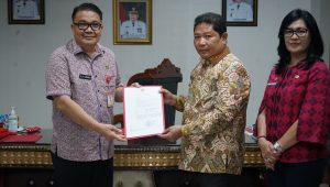 MINAHASA- Penjabat Bupati Minahasa, Dr Jemmy S. Kumendong didampingi Sekretaris Daerah (Sekda), Dr Lynda Watania, Kamis (30/11) bertempat di ruangan kantor Bupati Minahasa, menyerahkan Surat Keputusan (SK) Pelaksana Tugas (Plt) Kepala Dinas Pemberdayaan Perempuan Dan Perlindungan Anak (PPPA) Minahasa kepada Agustifo Tumundo.
